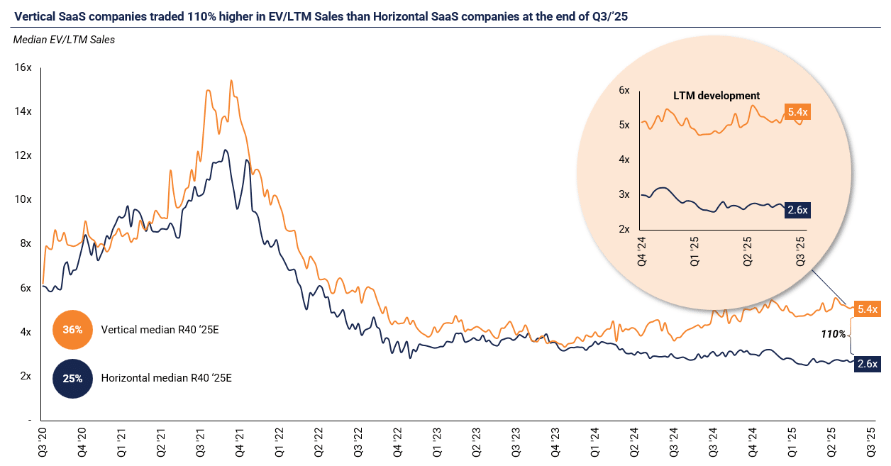 Vertical SaaS continues to outperform horizontal peers: The valuation gap between the two categories has widened further, with vertical SaaS companies now trading at a 110% premium to horizontal peers — up from 77% in Q1/’25. This growing divergence is making the categories increasingly difficult to compare directly. Therefore, our Q4/’25 report will provide separate analyses of performance and valuation metrics for each segment.