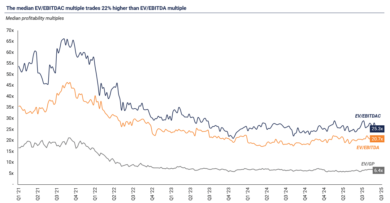 Expanding analysis of profitability multiples: With profitability now being the key driver of the Rule of 40 metric for most index constituents, we have expanded our analysis to provide a deeper review of historical performance — focusing on Gross Profit (GP), EBITDA, and EBITDAC (or Cash EBITDA, defined as EBITDA before capitalizations). Profitability multiples have remained relatively stable since late 2022, mirroring the trend seen in topline valuation metrics. The current EV/EBITDAC multiple for TSI constituents stands at 25.3x, compared to 20.7x for EV/EBITDA. This premium suggests that reported EBITDA figures are approximately 20% higher than EBITDAC, highlighting the impact of capitalized costs. Meanwhile, the EV/GP multiple remains steady at 6.4x, showing little change since mid-2022.